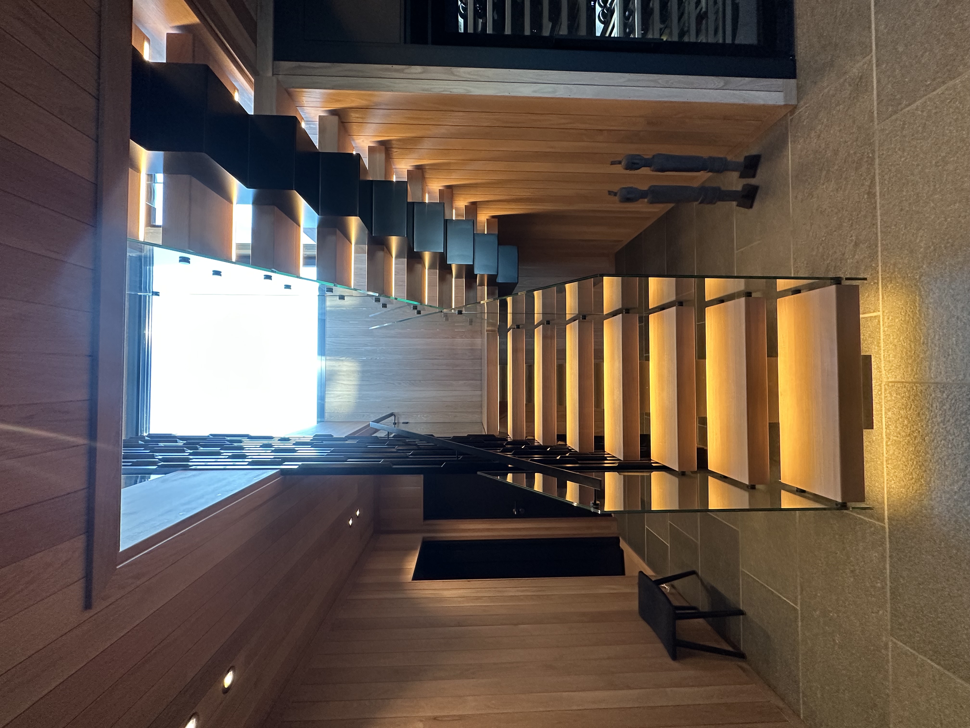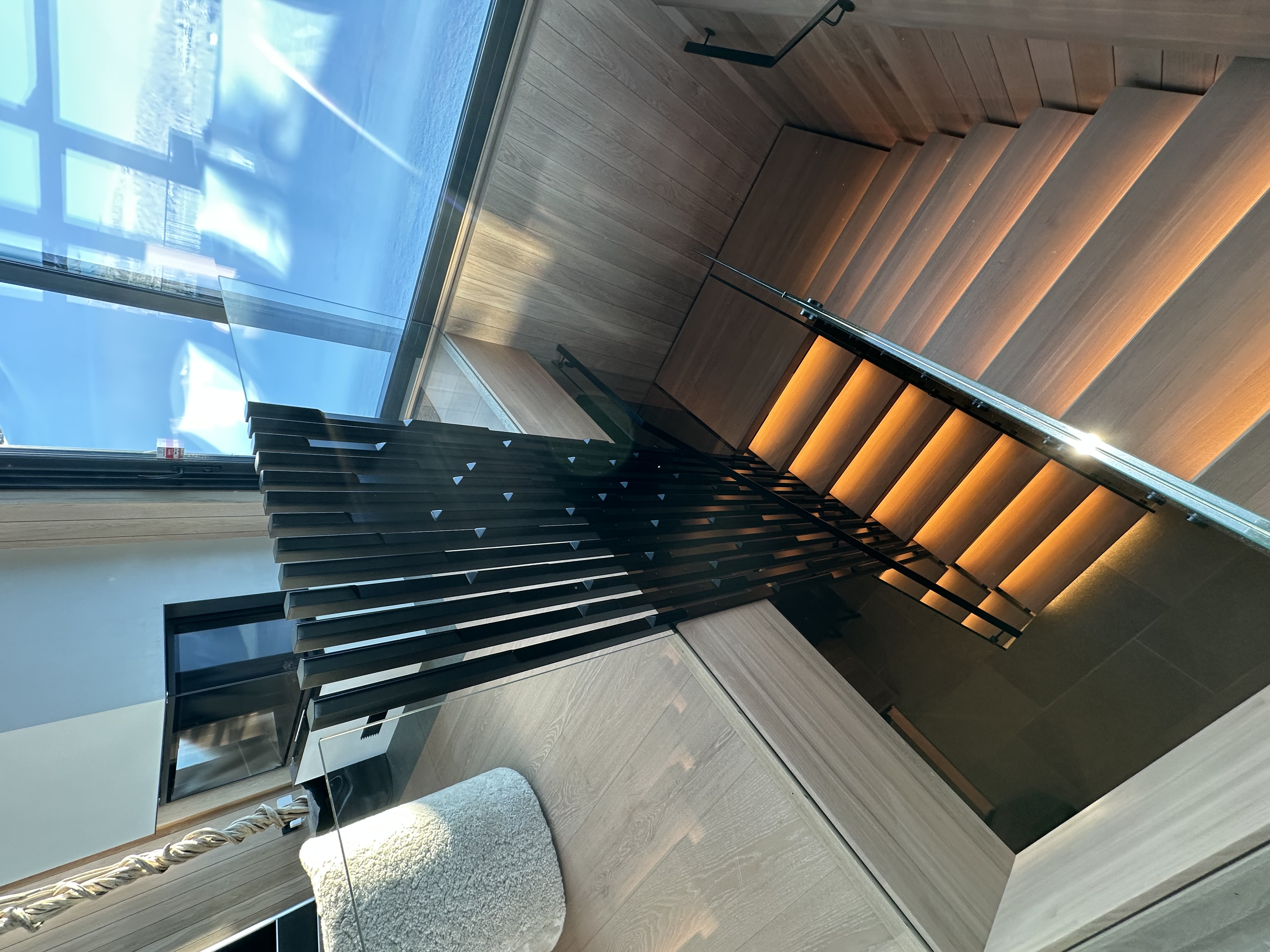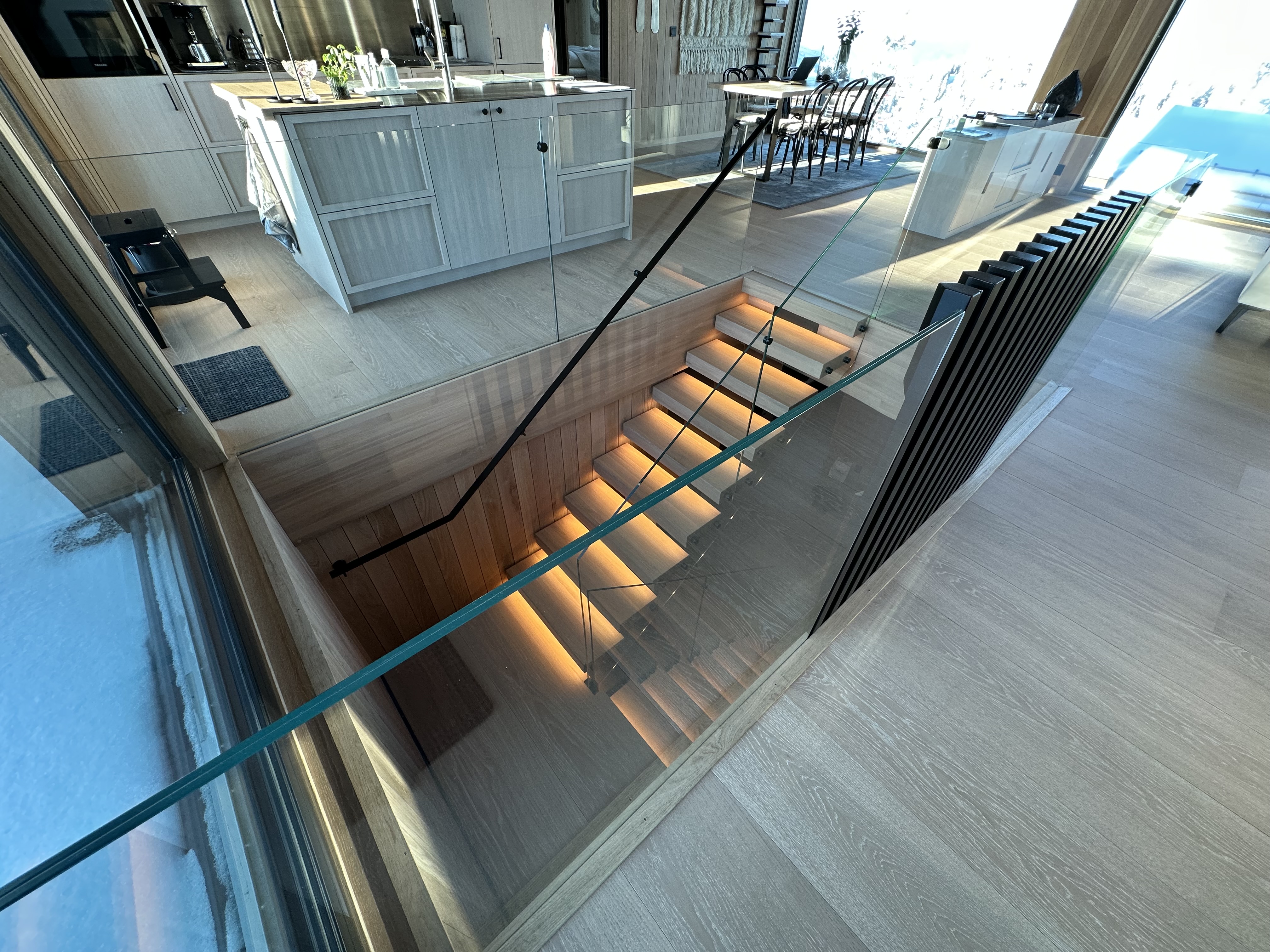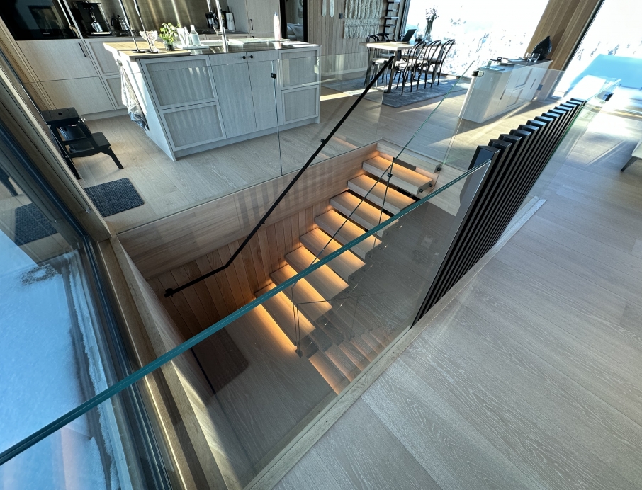 Er en moderne, åpen trapp med elegant kombinasjon av oljet eiketrinn og sortlakkert stålkonstruksjon. Det stilrene glassrekkverket gir en luftig og minimalistisk følelse, samtidig som integrert LED-belysning skaper en varm og innbydende atmosfære. Perfekt for contemporary hjem som ønsker en skulpturell og plassbesparende trappløsning med høy kvalitet og tidløst design.