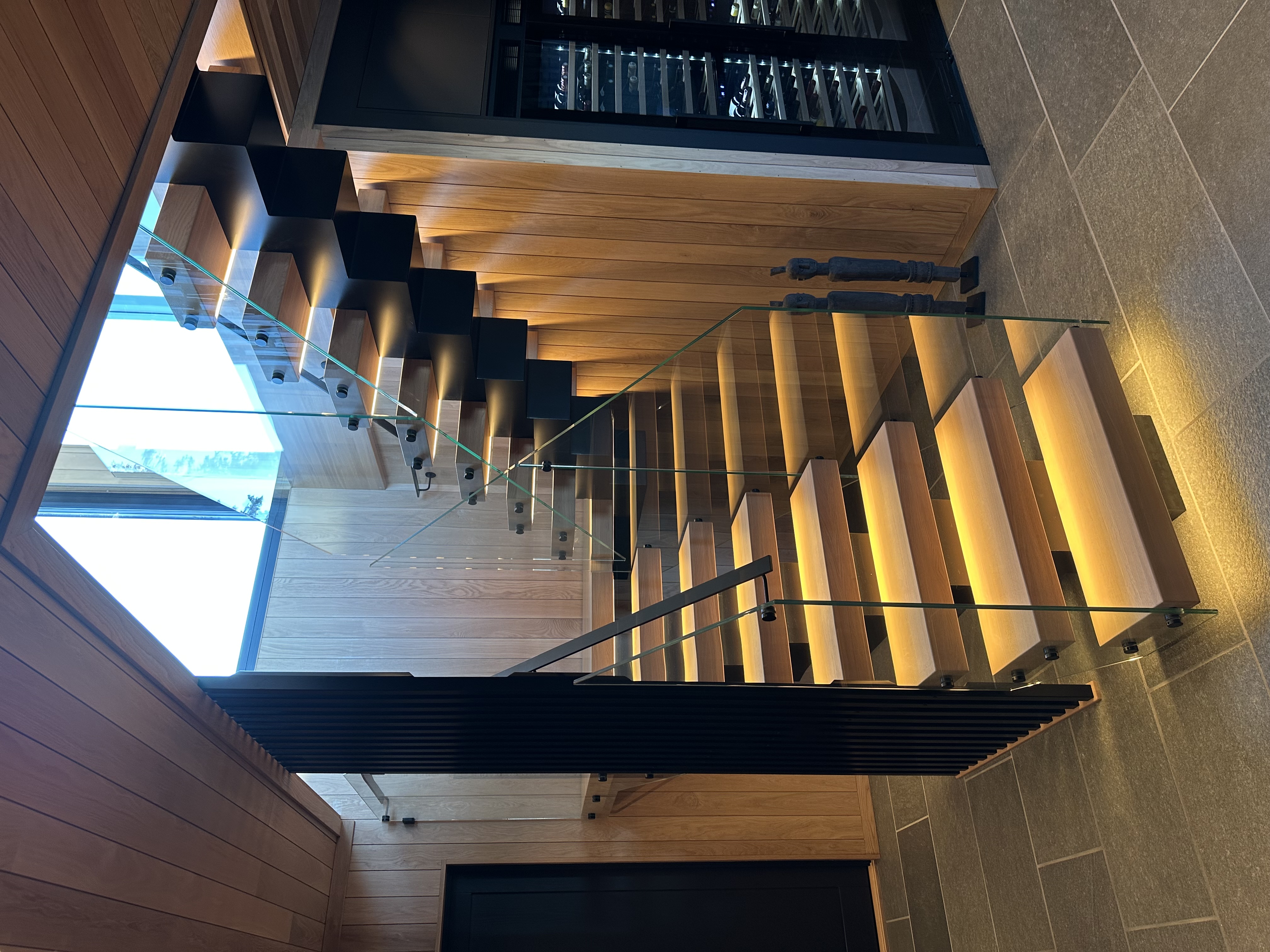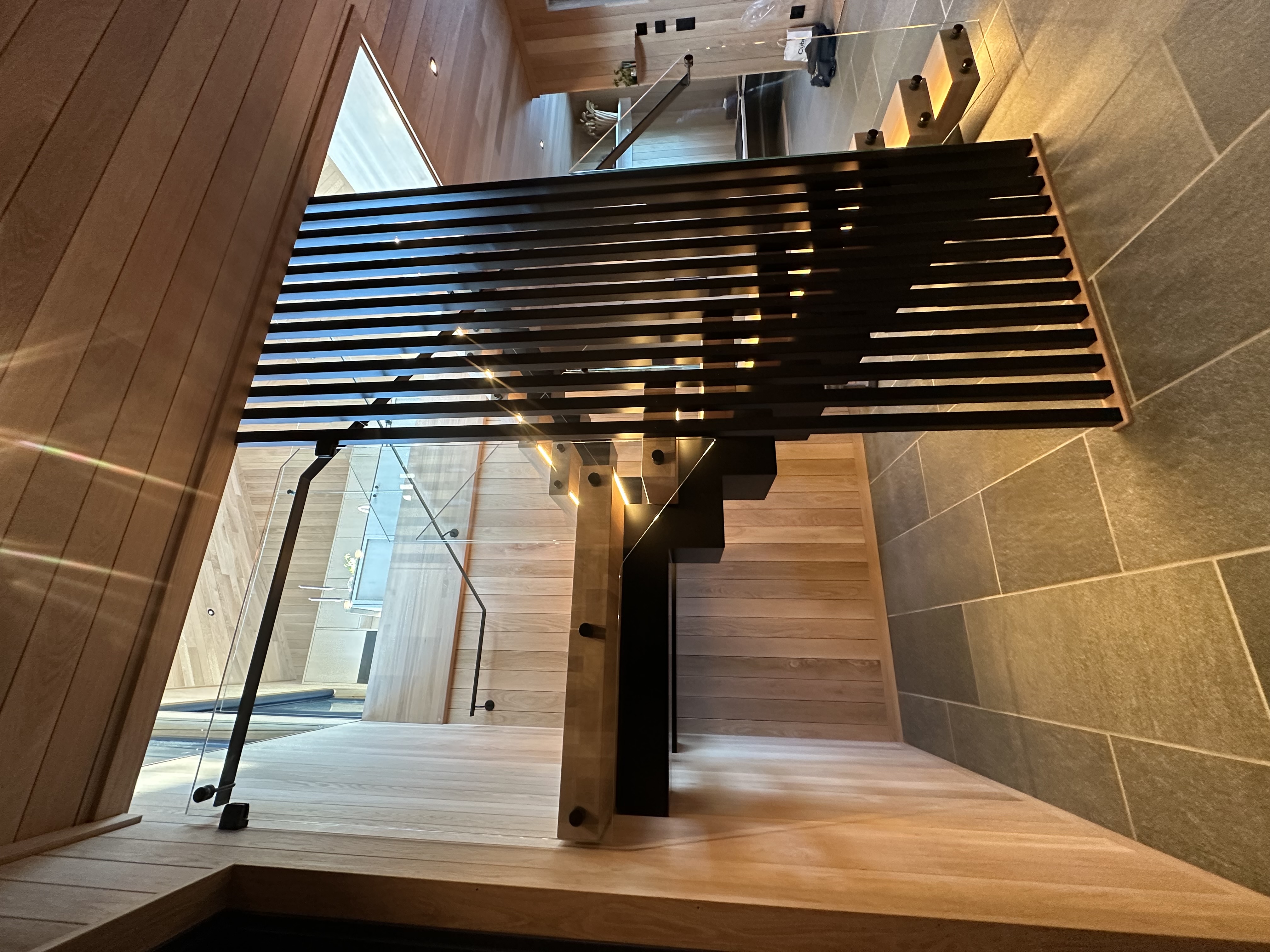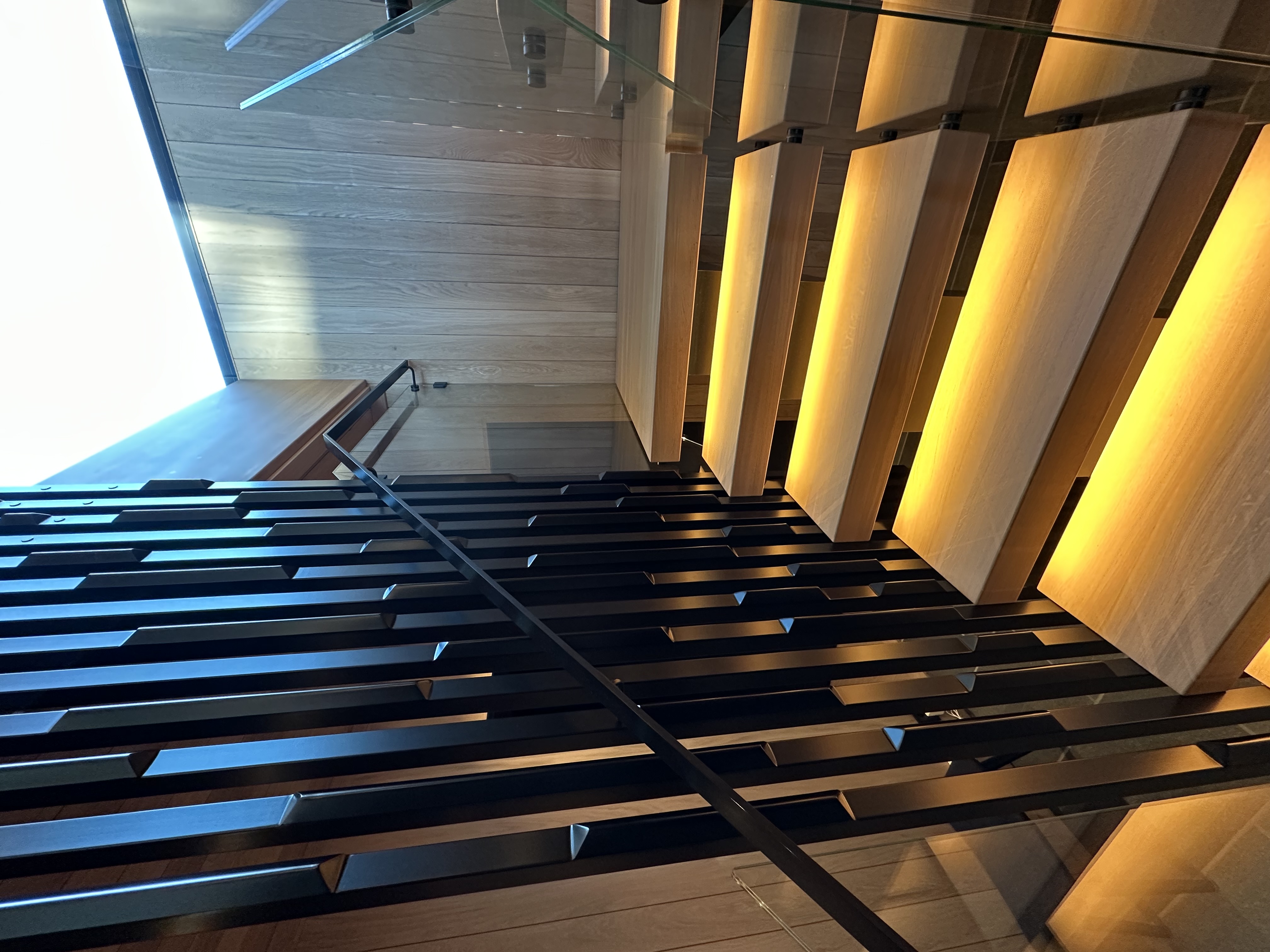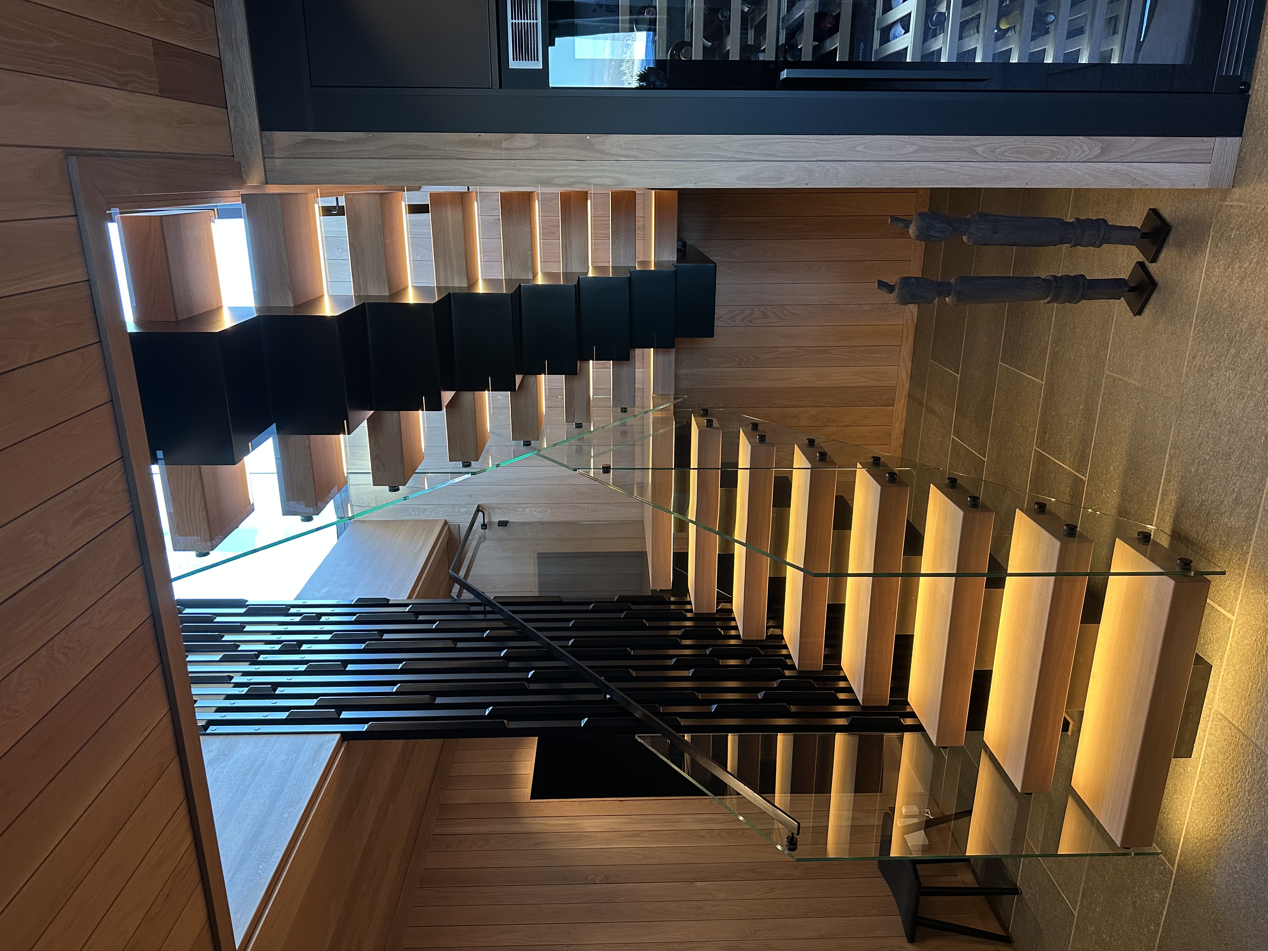 Er en moderne, åpen trapp med elegant kombinasjon av oljet eiketrinn og sortlakkert stålkonstruksjon. Det stilrene glassrekkverket gir en luftig og minimalistisk følelse, samtidig som integrert LED-belysning skaper en varm og innbydende atmosfære. Perfekt for contemporary hjem som ønsker en skulpturell og plassbesparende trappløsning med høy kvalitet og tidløst design.