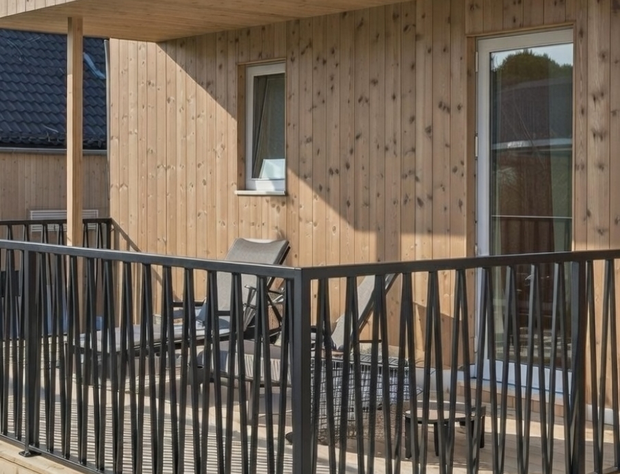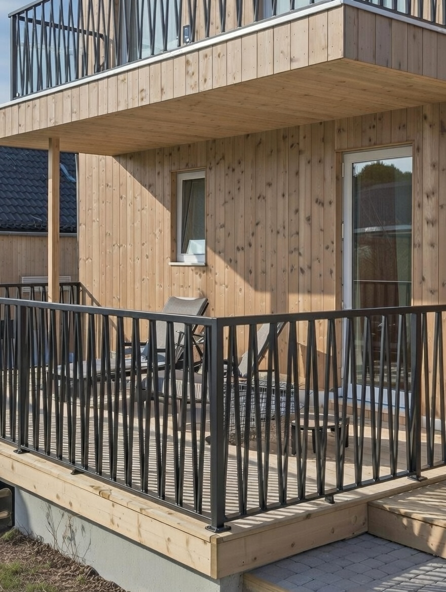 Stilrent og robust galvanisert rekkverk i sort pulverlakkert stål – maksimal beskyttelse mot vær og vind takket være dobbel overflatebehandling: først varmgalvanisering for korrosjonsbeskyttelse, deretter pulverlakk i valgfri RAL-farge for langvarig finish og estetikk. De slanke spilene gir et luftig og moderne uttrykk som slipper lys og utsikt gjennom, samtidig som det oppfyller alle sikkerhetskrav. Perfekt montert på treterrasse og balkong i moderne bolig – kombinerer industriell styrke med skandinavisk design. Et moderne rekkverk utendørs som tåler nordisk klima i mange år, uten rust eller vedlikeholdstrøbbel – ideelt for terrasse, balkong og uterom der både sikkerhet og stil teller.
