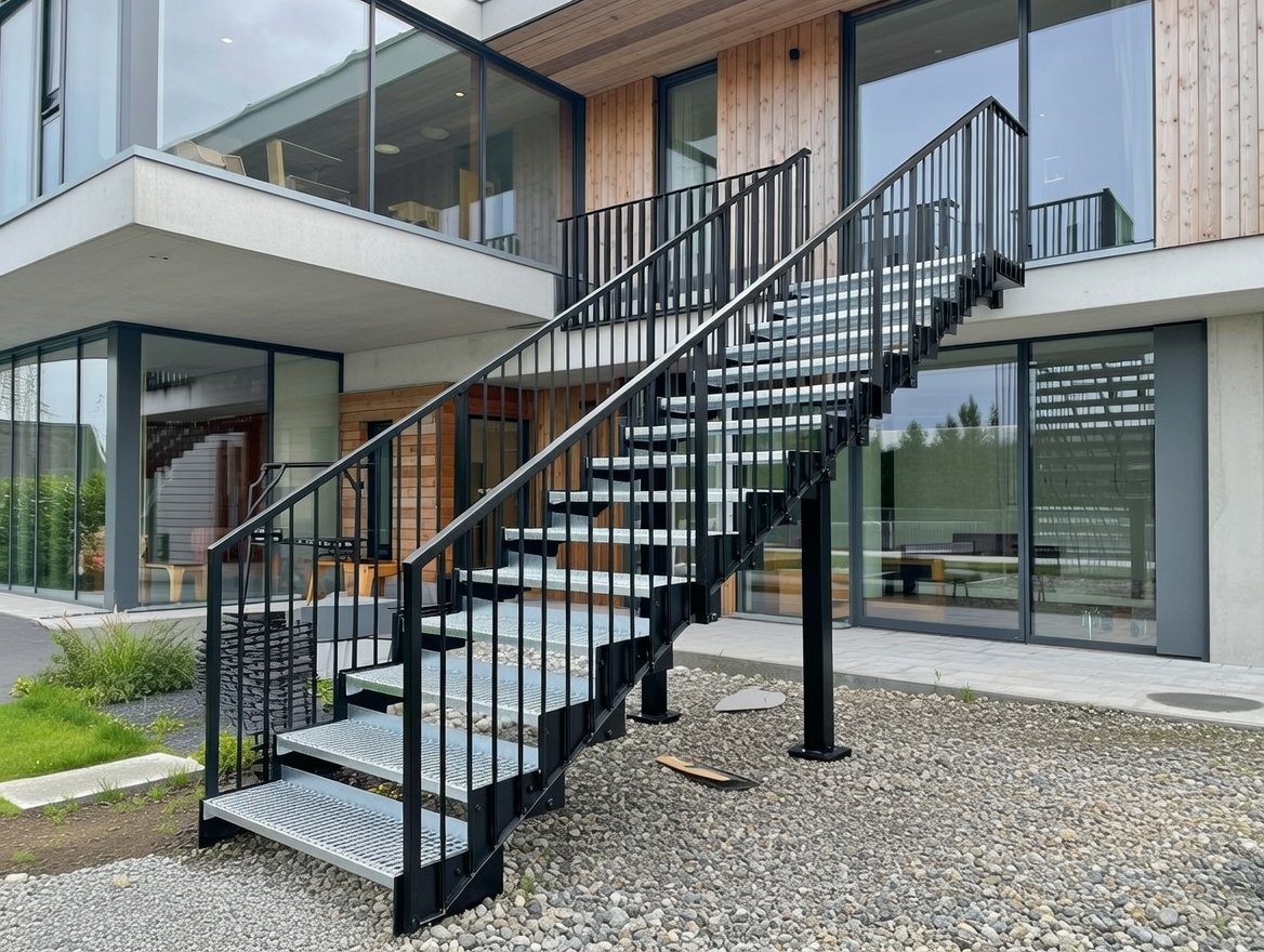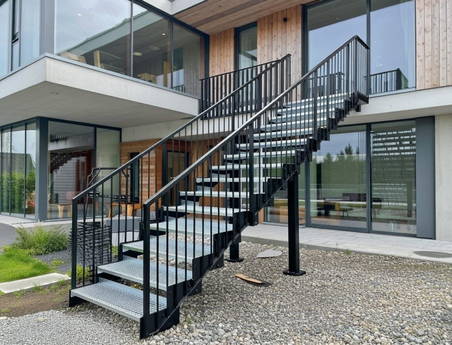 Robust og moderne ståltrapp utendørs – perfekt for terrasse, inngangsparti eller balkong i nordiske værforhold. Galvaniserte trinn i solid stål gir lang levetid, sklisikker overflate og minimal vedlikehold. Rekkverk og vanger er galvanisert og pulverlakkert i valgfri RAL-farge for optimal korrosjonsbeskyttelse og estetikk som matcher huset. Rekkverket har slanke 16 mm spiler, stolper og håndlist 40x40 mm – rent, trygt og luftig design som slipper lys og utsikt gjennom. Den rette formen og den åpne konstruksjonen skaper et lett og arkitektonisk uttrykk mot fasaden i tre og glass. En holdbar ute trapp i stål med høy kvalitet, fleksibel fargevalg og tidløs stil – ideell for moderne boliger som krever både funksjon og design i det fri.